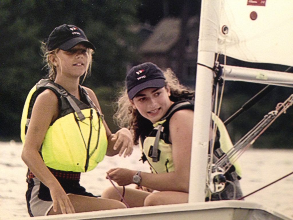 High above the trees is a bright blue sky extending far into the universe. The air is warm and fresh, in every direction is an upward slope covered in thick forests. This body of water is what appears to be the only clearing in this vast woods. Each wave rolls across the surface with white bubbles dancing on top. The leaves whirl vigorously clinging to the tree branches. The rigging rattles as it clangs against the mast and colorful boats rock back and forth, yanking on their moorings. In my life jacket that used to be neon yellow, but is now so faded it is almost white, with my dark curls blowing, and my bare feet, I am sitting on the edge of Geronimo adjusting the sails to harness the wind; in one hand is the tiller and in the other is the main sheet. Sitting beside me is Kate, in her, still neon, yellow life jacket, Ray-Ban sunglasses she stole from the lost and found, and her straight blond hair flying free, because her lucky hair tie sank. The water is splashing up and cooling the sun-cooked fiberglass that is burning our butts. The sun is baking our already pink faces. We arch our backs backwards so that we can dunk our heads into the cool water, but the forward movement floods water up our noses and into our ears; nevertheless, our mops of hair are now dripping cool water down our backs and faces. Comfortable and ready we trim in the sheets and point down wind just enough to pick up speed.