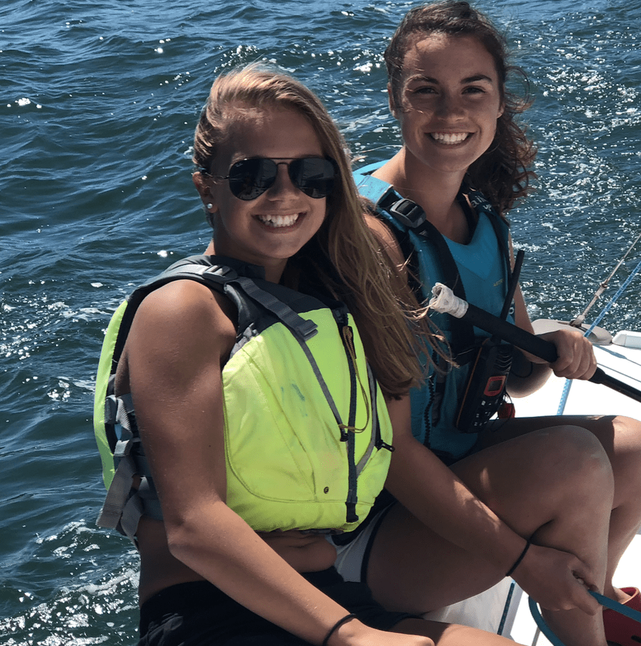 We emerge flying, skimming the surface of the water with more speed than you can imagine, water spraying up from both sides of the boat. I feel out of control. Trailing us is a wake you’d think would come from a ninety horsepower engine. Together, Kate and I laugh from pure joy until our bellies hurt. In the distance a loon laughs at us and then dives under quickly to avoid the missile, that is us, coming at it. “Hold on!” I yell, as Kate loses her balance because she was holding the jib sheets with her toes; an obviously pour choice. My arm instinctively flies out to catch her. Laughing, song lyrics from Hannah Montana start flowing out. Then the song switches to “How far I’ll go” from Moana, and then to the chorus of “West Virginia”. Soaking wet, with my curls dancing in all directions and her golden mane still flying in the wind, thirsty and sun baked, we sail as the wind relentlessly blows.