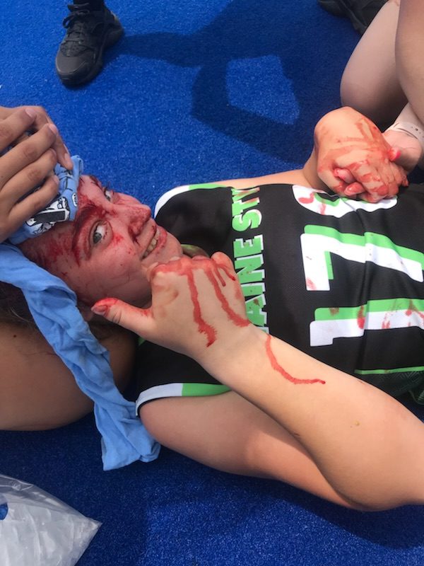 At first I felt her shoulder, then came the impact of the rest of her. At first; It didn’t hurt. She was lying unconscious next to me, and I was sitting on the ground, oblivious to the horrors that awaited me. I hopped up, grabbed my stick and went back into play. I looked around, and then it came pouring down my face, covering me head to toe. My jersey, once black and white, was now red and black. I was disoriented. All I could hear were the screams all around me. The coach from the other team directed me to lie down, while my coach ran onto the field, laid me down, and started to put pressure on my head. My vision started to get blurry, and I started to turn a gray color. I heard a flurry of voices, my coach, the refs, my parents. I heard the team crying, and I was still not sure what had happened. It was chaos all around me, but I was so calm, telling everyone that I was “fine”, confirming with a “thumbs up.” I was almost too calm. Then I heard the sirens. I was loaded into the ambulance, trying to stay awake, so that my mother didn’t freak out. We were rushed to the hospital, and at that moment, I knew it was something much more serious.